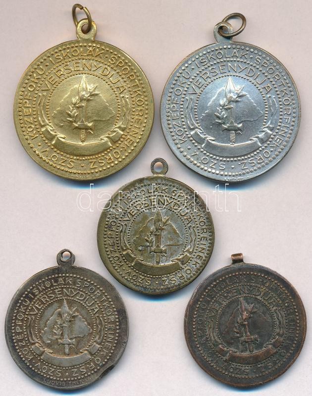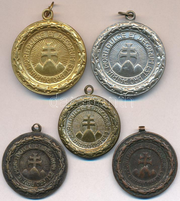 DN "Dulce et Decorum est Pro Patria / Középfokú Iskolák Sportköreinek Versenydíja" irredenta díjérem (5x) különböző méretekben, 2db ezüstözött és 1db aranyozott, 1db "Ludwig" gyártói jelzéssel és 1db "Ludwig Thék u." T:2