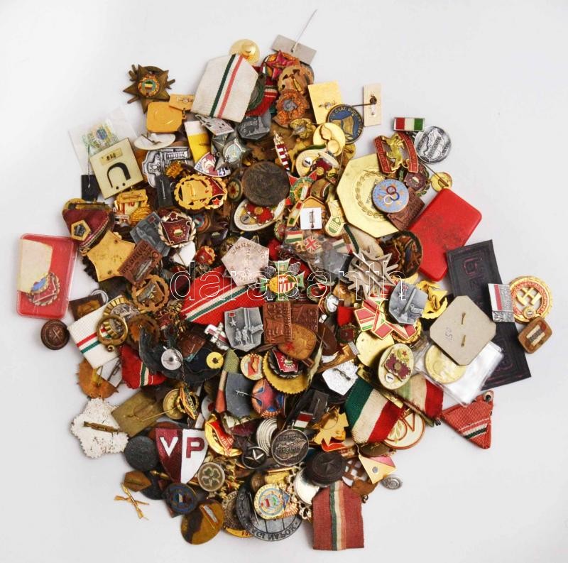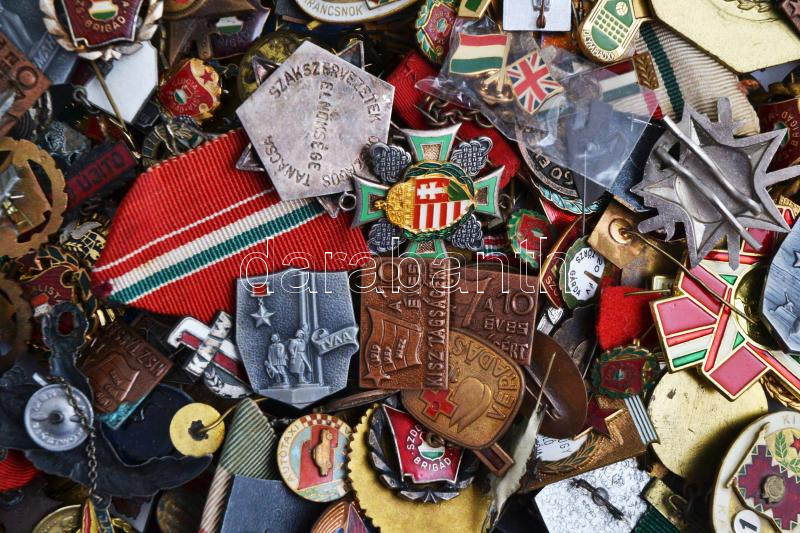 Vegyes magyar kitűző és jelvény tétel néhány emlékéremmel, összesen ~2,3kg súlyban, falerisztika és militária vegyesen, közte DN "A Magyar Néphadsereg kiváló katonája" zománcozott fém sapkajelvény, DN "Önkéntes ápoló" zománcozott fém jelvény, DN "Kiváló kohász" fém emlékérem szalag nélkül, 1937. "Székesfehérvár Szabad Királyi Város" Br emlékérem T:vegyes