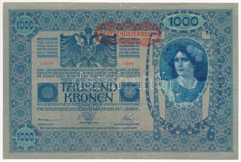 Beschreibung: 1902. 1000K mindkét oldal német, hátlap rajz, "DEUTSCHÖSTERREICH" felülbélyegzéssel (3x) T:III egyiken tűnyom Adamo SK35/2