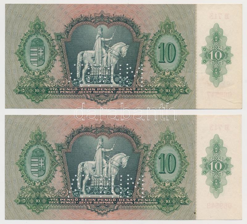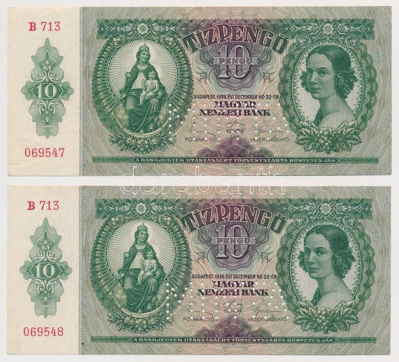 1936. 10P (2x) sorszámkövetők, mindkettő hamis "MINTA" perforációval T... https://www.darabanth.com/de/270-Fernauktion/270.0/Numismatik/Ungarische-Banknoten~200007/1936-10P-2x-sorszamkovetok-mindketto-hamis-MINTA-perforacioval-TI-I-~II1364424