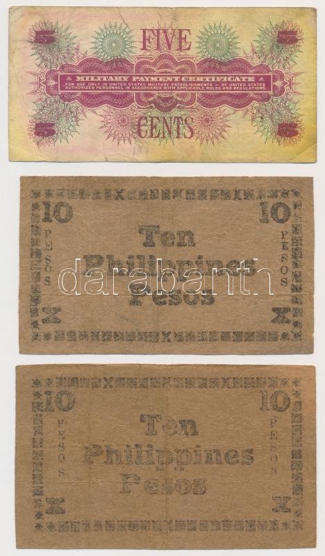 Mixed: USA / Military Payment Certificate 1968. 5 Cents + Philippines 1944. 10 Pesos (2x) necessity notes C:F,VG
