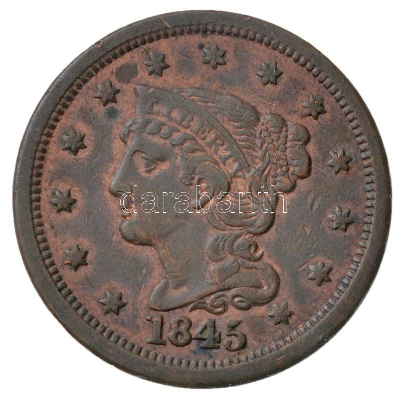USA 1845. 1 Cent Cu C:VF https://www.darabanth.com/de/270-Fernauktion/270.0/Numismatik/Weltweit-Munzen~200013/Amerikai-Egyesult-Allamok-1845-1c-Cu-T2---USA-1845-1-Cent-Cu-CVF~II1365394