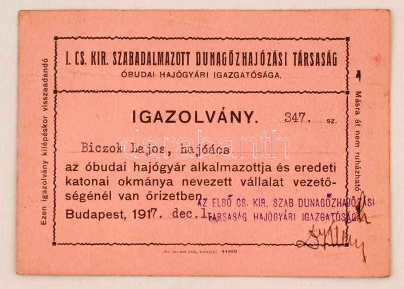 1917 Igazolvány, I.Cs. Kir. Szabadalmazott Dunagőzhajózási Társaság, Ó... https://www.darabanth.com/de/271-Fernauktion/271.0/Andere-Sammelgebiete/Dokument~17/1917-Igazolvany-ICs-Kir-Szabadalmazott-Dunagozhajozasi-Tarsasag-Obudai-Hajogyari-Igazg~II1308328