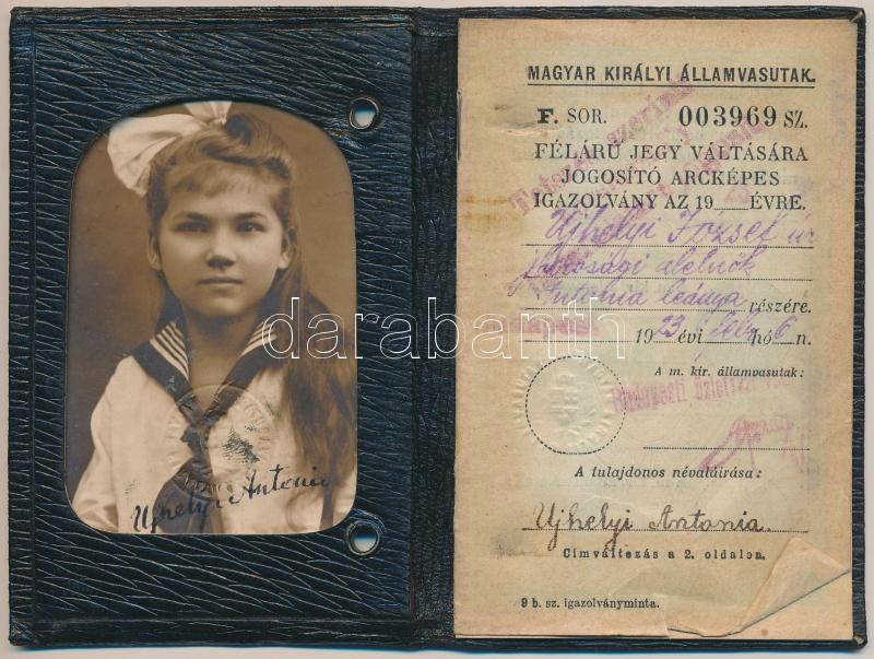 1923 Félárú jegyváltásra jogosító fényképes MÁV-igazolvány királyi jár... https://www.darabanth.com/de/271-Fernauktion/271.0/Andere-Sammelgebiete/Dokument~17/1923-Felaru-jegyvaltasra-jogosito-fenykepes-MAV-igazolvany-kiralyi-jarasbiro-keso~II1248250