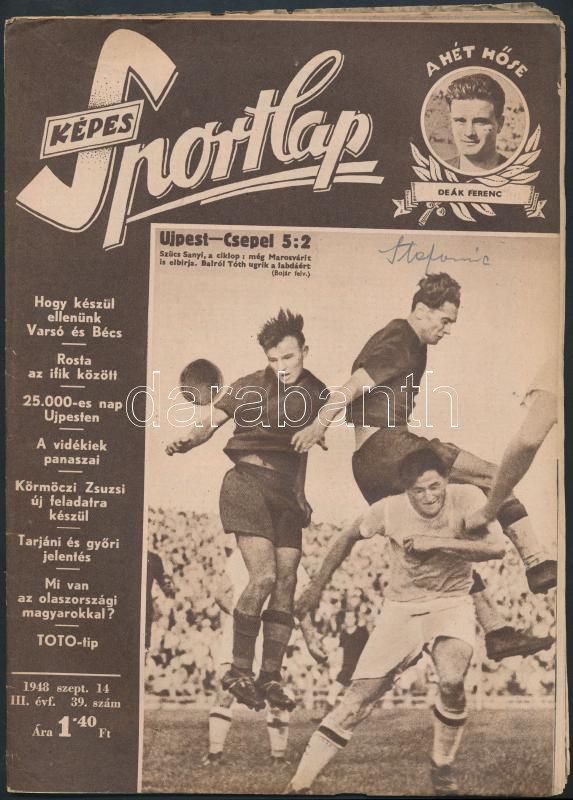 1948 A Képes Sportlap III. évfolyam 39. szám, címlapon az Újpest-Csepe... https://www.darabanth.com/de/271-Fernauktion/271.0/Andere-Sammelgebiete/Drucksachen~32/1948-A-Kepes-Sportlap-III-evfolyam-39-szam-cimlapon-az-Ujpest-Csepel-osszecsapasaval~II1372904