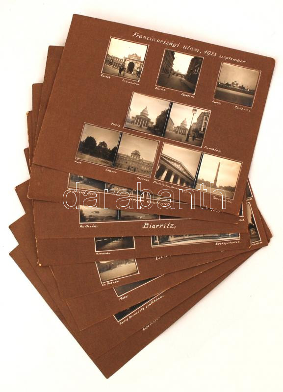 1928 kisméretű fekete-fehér fotók, többnyire franciaországi látképekkel, vászonlapokra felragasztva. Összesen 49 db fotó, 8 (albumból kivágott) kartonlapra felragasztva, külön-külön képaláírásokkal. A legtöbb fotó Párizsban készült, de van közte Marseille, Nizza, illetve Padova is.