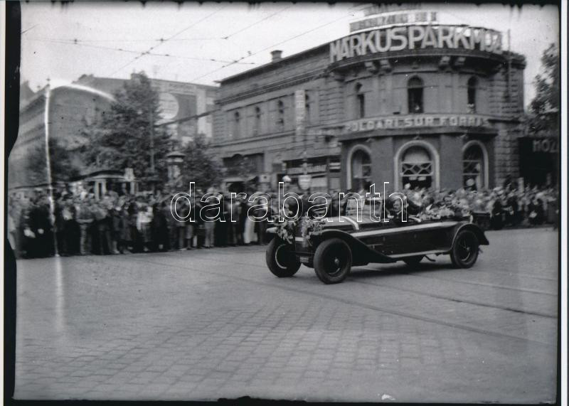 cca 1930 Budapest, Astória, régi autóban fontos ember, a háttérben a Márkus parki mozi reklámja és bejárata, korabeli negatív modern nagyítása, 13x18 cm