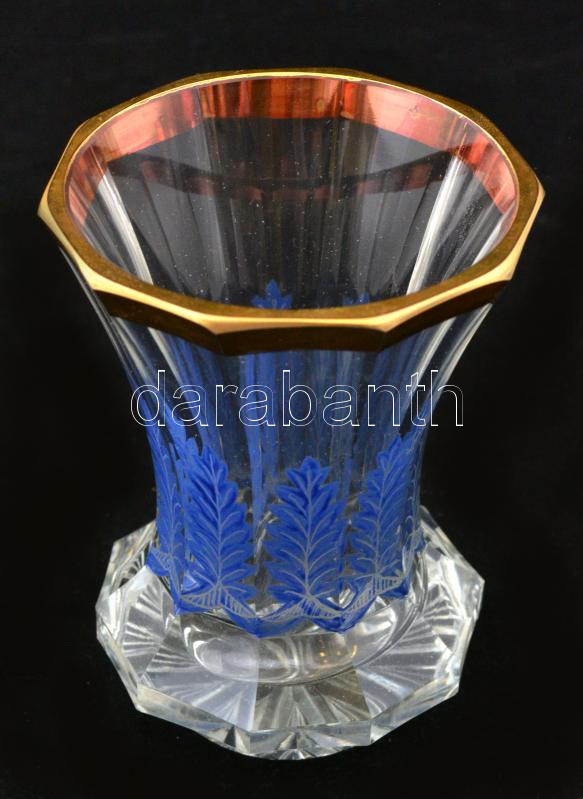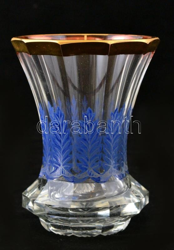 Beschreibung: cca 1860 Emlékpohár, formába fúvott, hámozott üveg, csiszolt, zománc festett, aranyozott peremmel, egészen apró hibával, m:12cm