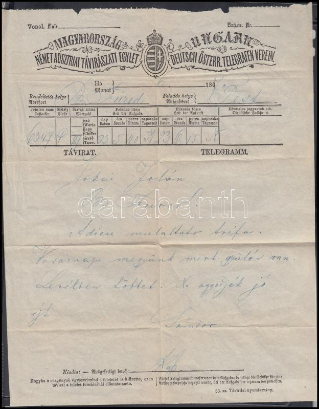 1870 Hegedüs Sándor (1847-1906) távirata Jókai Jolánnak, jövendő feleségének, Balatonfüredre.