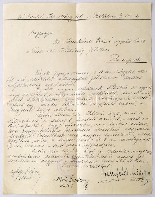 1942 A VII. kerületi izraelita nőegylet elnökének Grünfeld Mirjamnak levele Munkácsi Ernő (1896-1950) ügyvéd, jogi író. A Pesti Izraelita Hitközség, majd a Zsidó Tanács főtitkárának.