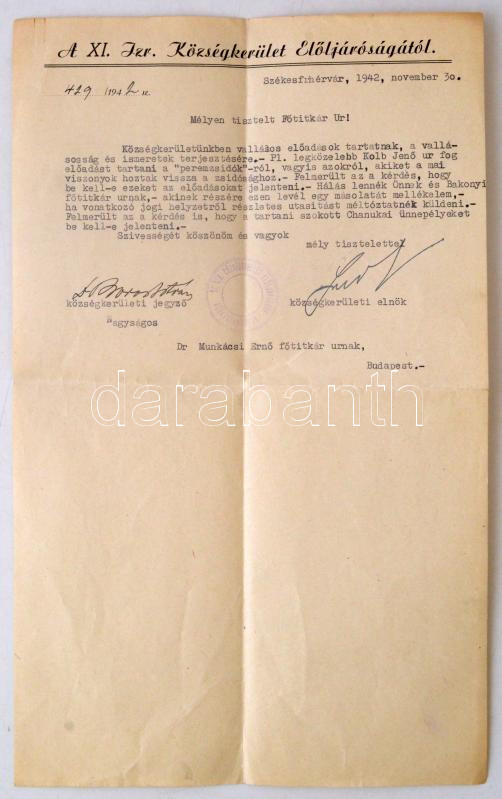 1943 A székesfehérvári Izraelita községkerület elöljáróságának levele Munkácsi Ernő (1896-1950) ügyvéd, jogi író. A Pesti Izraelita Hitközség, majd a Zsidó Tanács főtitkárának.