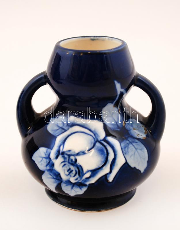 Beschreibung: Rózsával díszített kék kerámia vázácska, jelzés nélkül, hibátlan, m: 7,5 cm