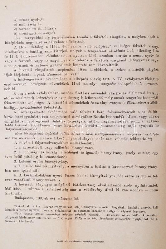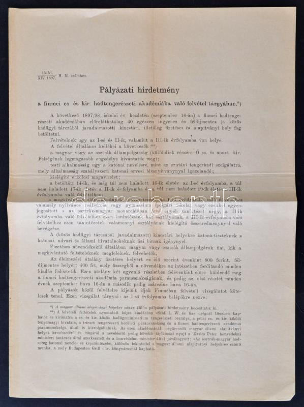 Beschreibung: 1897 Pályázati hirdetmény a fiumei cs. és kir. haditengerészeti akadémiára való felvétel tárgyában