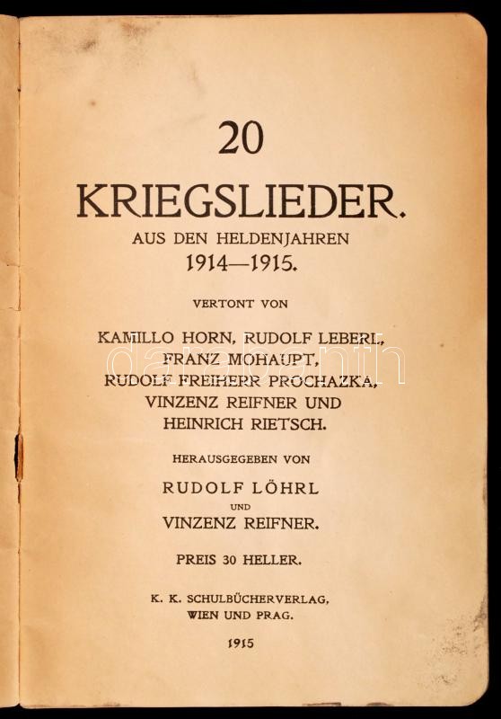 1915 Kriegslieder Wien, Prag. 1915. Schulbücher Verlag. 28p. / Katona... https://www.darabanth.com/de/271-Fernauktion/271.0/Andere-Sammelgebiete/Militaria~28/1915-Kriegslieder-Wien-Prag-1915-Schulbucher-Verlag-28p-Katonadalok-az-I-vilaghaborubo~II1373603
