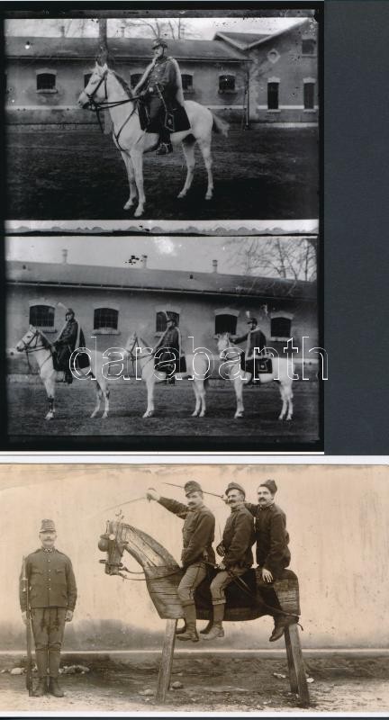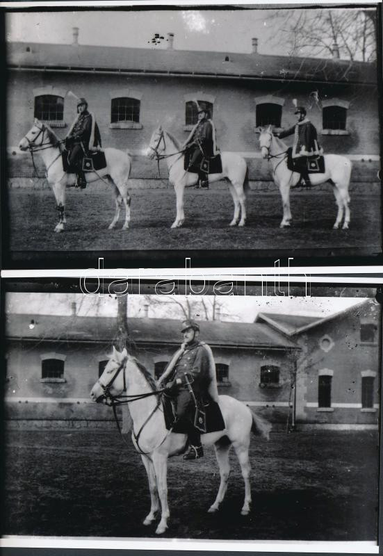 cca 1935 Huszárok és kiképzésük, Lőcsey Árpád kecskeméti vándorfényképész hagyatékában őrzött 3 db üveglemez negatív modern nagyítása, 13x18 cm + 1 db modern másolat régi képről, 10x15 cm