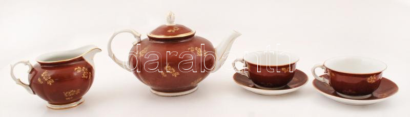 Beschreibung: Hollóházi porcelán teás készlet, hiányos: kanna (m: 16 cm), kiöntő (m: 10 cm), 2 db csésze+alj (d: 10,5 ill. 14,5 cm), kézzel festettek, jelzettek, kis kopásnyomokkal