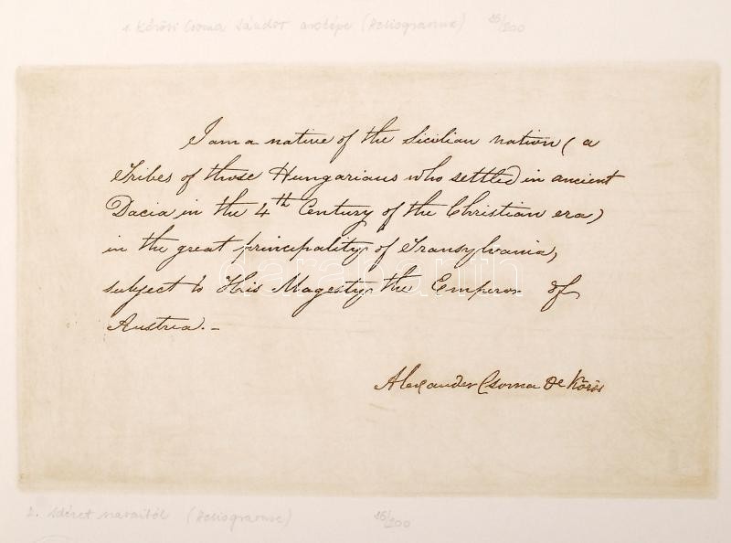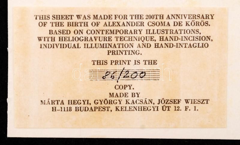 Zarándok tudós. Kőrösi Csoma Sándor születésének 200. évfordulója alkalmából készült grafikai mappa, A Kőrösi Csoma Emlékbizottság megbízásából. A grafikai lapok egykorú metszetek felhasználásával, heliogravure eljárásssal, kézi utánmetszéssel, egyedi színezéssel és kézi mélynyomással készültek. Készítette: Hegyi Márta, Kacsán György és Wieszt József, Kemény Zoltán és Hegyi Antal közreműködésével. Kiadói nagyméretű egészvászon mappában, 32 táblán összesen 40 metszettel + 1 tábla 3 különnyomattal. Készült mindössze 200 példányban. Minden kép és tábla számozott, 86/200 számot viseli, a táblákon szárazpecsét, hátlapjukon certifikáció. Rendkívül értékes ritkaság! / Pilgrim scholar. Graphic album made for the 200th anniversary of the birth of Alexander Csoma de Koros. / Bicentenary - 1984, Hungary. Based on contemporary illustrations, with heliogravure technique, hand-incision, individual illumination and hand-intaglio printing. Made by Marta Hegyi, Gyorgy Kacsan, Jozsef Wieszt. Cloth-binded portfolio with 40(+3) pictures on 32(+1) leaves of plates (embossed stamp on each leaf). Extremely rare limited edition of 200 copies, each grapchical picture and leaf of plate wears the number of 86 out of 200.