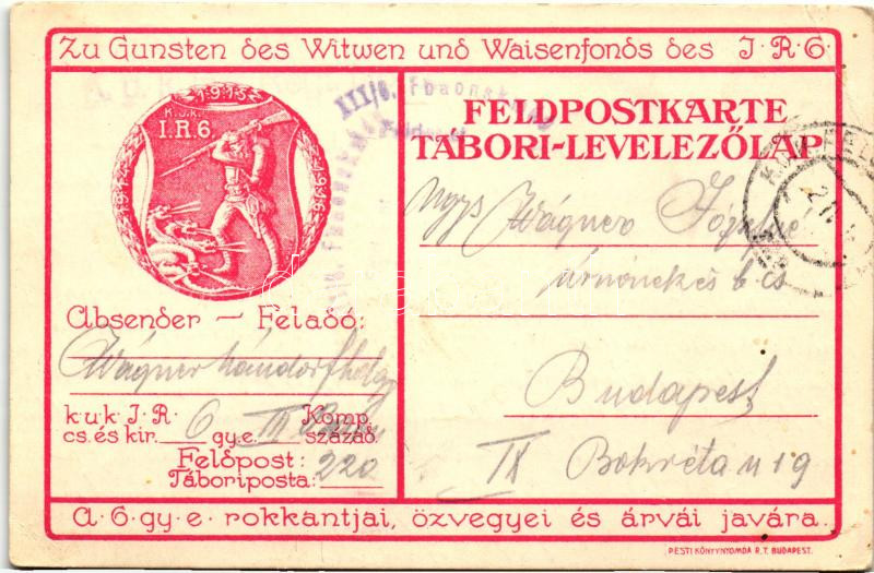Cs. és Kir. 6. gyalogezred rokkantjai, özvegyei és árvái javára / 1915... https://www.darabanth.com/de/271-Fernauktion/271.0/Ansichtskarten/Militaria~200059/Cs-es-Kir-6-gyalogezred-rokkantjai-ozvegyei-es-arvai-javara-1915-KuK-Infantry-Regimen~II1370878