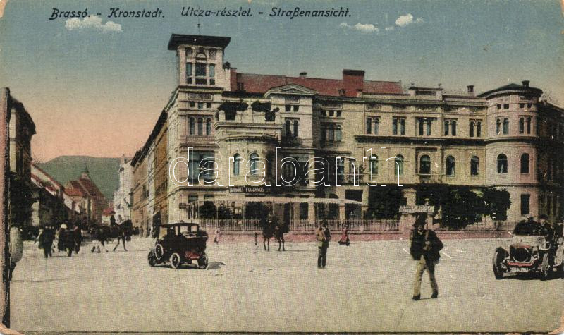 Beschreibung: Brassó, Kronstadt; utca, fogorvos, Rezer Adolf üzlete / street, dentist, shop, automobiles
