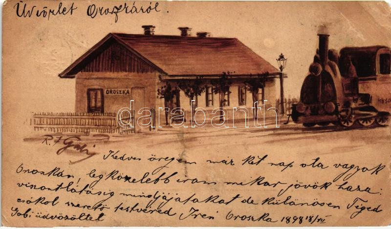 Beschreibung: 1898 Oroszka, Pohronsky Ruskov; vasútállomás, gőzmozdony, kézzel festett képeslap / railway station, locomotive, hand-painted postcard, artist signed (Ga) (b)