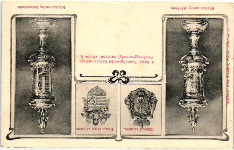Beschreibung: Kassa, Kosice; Kassai Sport-Egyesület Rákóczi-serlege, címerek; Nyulászi Béla kiadása / memorial sport goblet, coat of arms, Art Nouveau