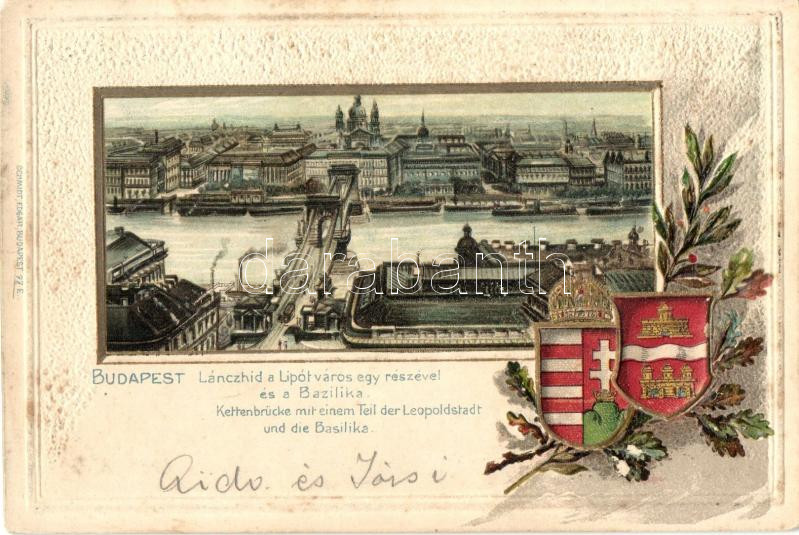 Beschreibung: Budapest, Lánchíd, Lipótváros egy része, Bazilika, címer, floral, Emb. litho (EK)