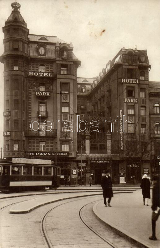 Beschreibung: Budapest VII. Park Szálloda és étterem, Szent István cukorka és csokoládé üzlet, villamos (EK)
