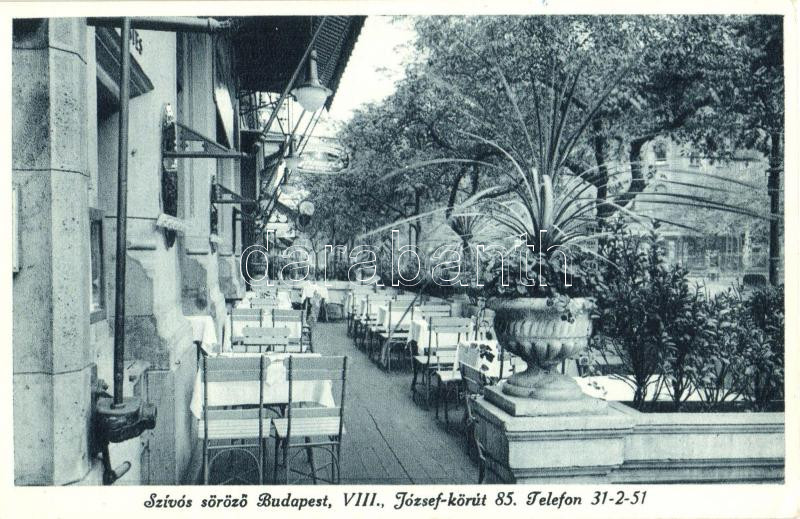 Budapest VIII. József körút 85. Szívós söröző, terasz https://www.darabanth.com/de/271-Fernauktion/271.0/Ansichtskarten/Ungarn~200006/Budapest-VIII-Jozsef-korut-85-Szivos-sorozo-terasz~II1377066