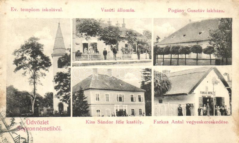 Sopronnémeti, Vasútállomás, Farkas Antal vegyeskereskedése, Kiss Sándor féle kastély, evangélikus templom, iskola, Pogány Gusztáv lakháza, kiadja Steegmüller fényiroda (kis szakadás / small tear)