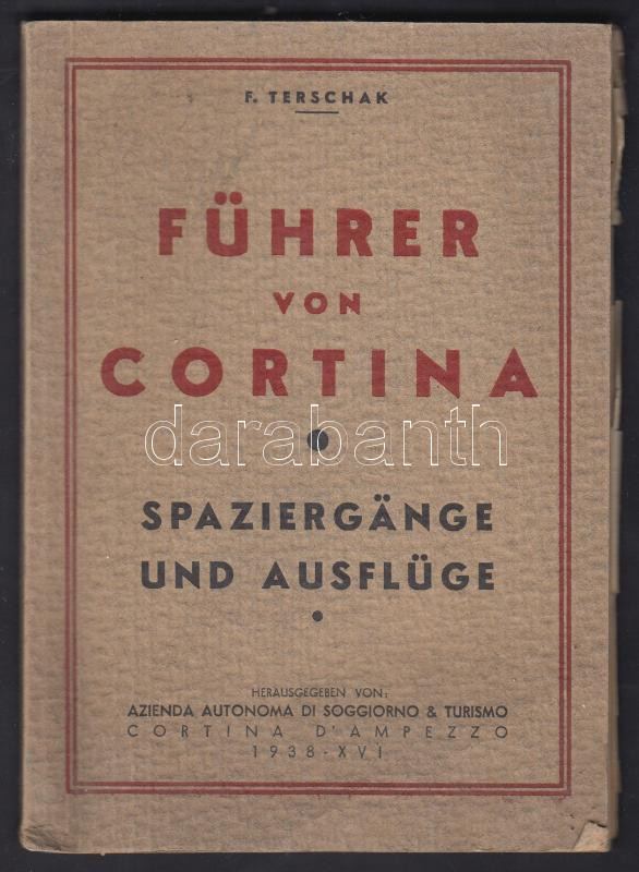Terschak, F.: Führer von Cortina. Spaziergänge und Ausflüge. Cortina d'Ampezzo, 1938, Azienda Autonoma di Soggiorno e Turismo. Térképmellékletekkel, fekete-fehér fényképekkel. Kopott papírkötésben, egyébként jó állapotban.