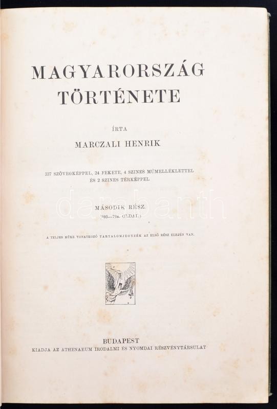 A műveltség könyvtára. Marczali Henrik: Magyarország története. Második rész. Bp., 1911. Athenaeum. Aranyozott, dombornyomásos kiadói félvászon-kötésben, a gerinc sarkainál enyhe sérüléssel.