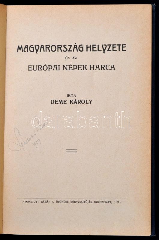 Deme Károly: Magyarország helyzete és az európai népek harca. Kolozsvá... https://www.darabanth.com/de/271-Fernauktion/271.0/Bucher/Bucher-Geschichte~35/Deme-Karoly-Magyarorszag-helyzete-es-az-europai-nepek-harca-Kolozsvar-1913-Gaman-J-101-~II1368696