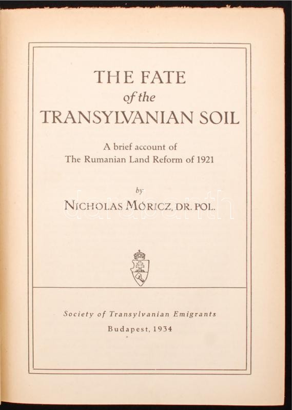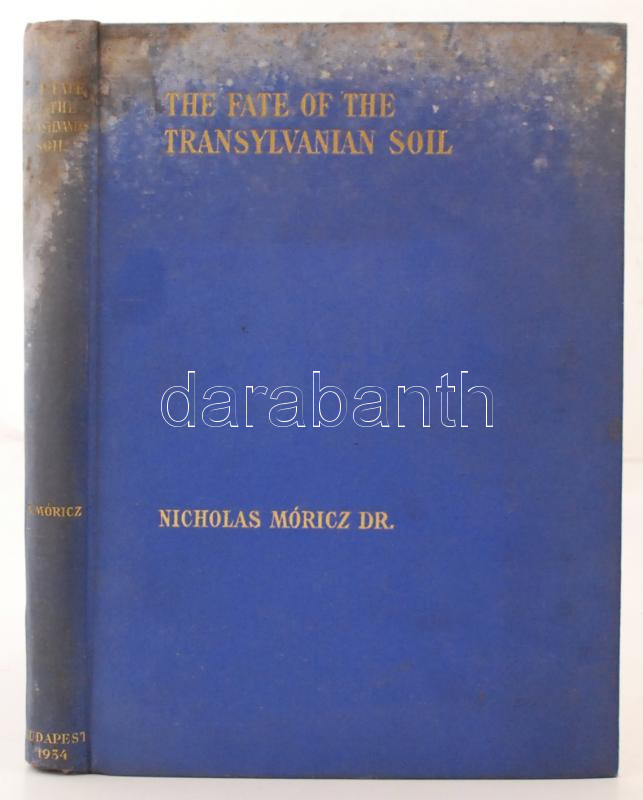 Dr. Nicholas Móricz: The Fate of the Transylvanian Soil (Az erdélyi föld sorsa. Az 1921. évi román földreform). Bp., 1934, Society of the Transylvanian Emigrants. Kiadói foltos, elszíneződött egészvászon-kötésben, két térképmelléklettel. A 25. oldaltól felvágatlan. / Stained cloth-binding, two cartograms included.