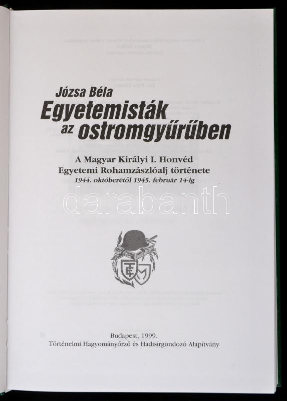 Józsa Béla: Egyetemisták az ostromgyűrűben. A Magyar Királyi I. Honvéd Egyetemi zászlóalj története. 1944. októberétől 1945. február 14-ig. Budapest, 1999, Történelmi Hagyományőrző és Hadisírgondozó Alapítvány. Illusztrált kiadói kemény kötésben. Szép állapotban