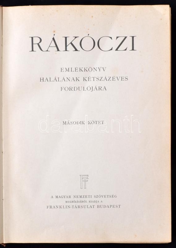 Rákóczi emlékkönyv halálának kétszázéves fordulójára. Szerk.: Lukinich Imre. 2. köt. Bp., [1935], Franklin Társulat. Dombornyomott, kicsit kopott bőrkötésben, gerince hiányzik, egyébként jó állapotban.