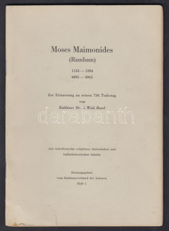 A. Weil: Moses Maimonides (Rambam) 1135-1204, 4895-4965, Zur Erinnerung an seinen 750. Todestag von Rabbiner Dr. A. Weil. Basel, é.n., Rabbinerverband der Schweiz, 40 p. Kiadói tűzött papírkötés. Német nyelven.