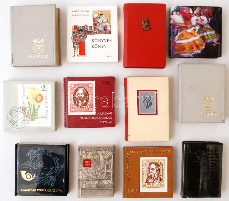 Beschreibung: 12 db vegyes minikönyv-A Magyar Tanácsköztársaság bélyegei, A Magyar Posta és az UPU, Rákóczi kiáltványa, Könyvnyomtatás Magyarországon, stb.