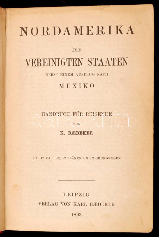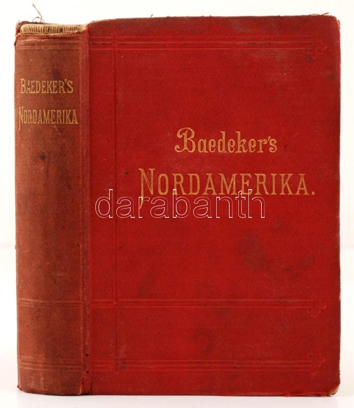 Karl Baedeker: Nordamerika. Die Vereiningten Staaten nebst einem ausflug nach Mexiko. Handbuch für Reisiende. Leipzig,1893, Verlag von Karl Baedeker, LVIII +488 p. Kiadói aranyozott egészvászon kötés, festett lapélekkel. Térképekkel illusztrálva. Német nyelven. A borÃtója kopott, foltos, sérült. A kötése sérült. A lapok foltosak. / Cloth binding, in german language. The cover is worn, spotty, and damaged. The binding is damaged. The pages are spotty.