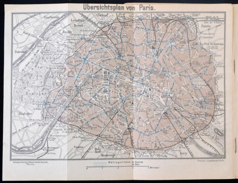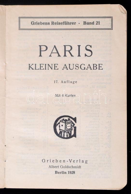 Paris Kleine Ausgabe. Griebens Reiseführer 21. Berlin, 1928, Grieben-Verlag, 121+V. Kiadói papírkötés. Párizs kalauz, német nyelven. A borítója szakadozott. / Paris Guide. Paperbinding, in german language.