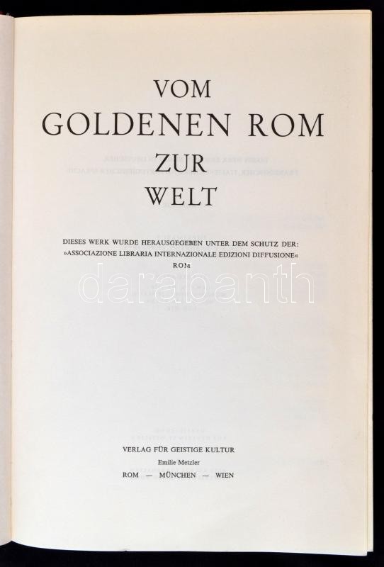 Beschreibung: Chiminelli, Piero: Vom Goldenen Rom zur Welt. Rom-München-Wien, é.n., Verlag für Geistige Kultur. Aranyozott kiadói egészvászon kötésben.