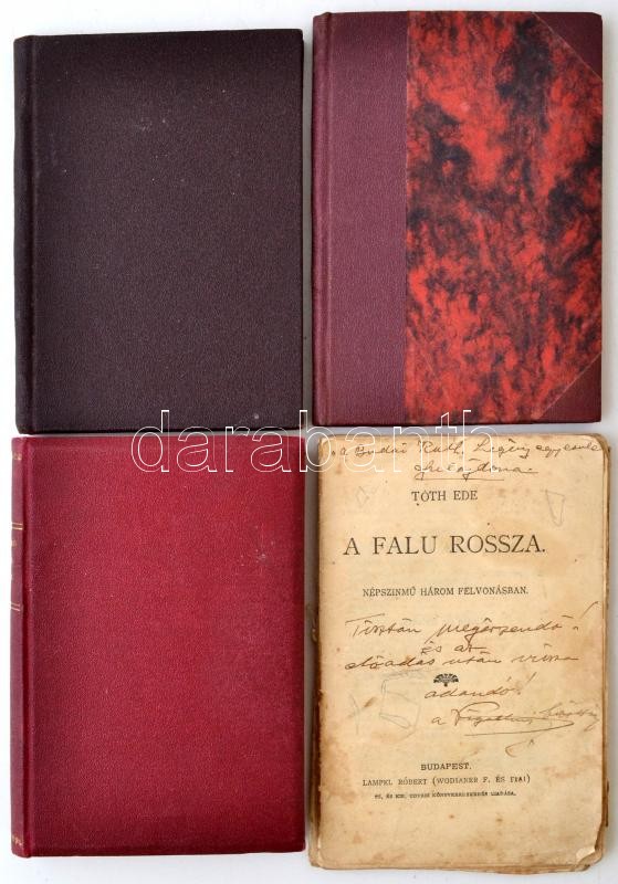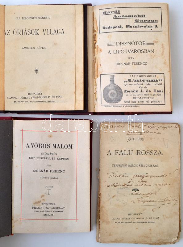 Beschreibung: 5 db könyv-Antal Iván: Visszavárók. Bp., 1923, sajtótanfolyam KÃsérleti Nyomdája; Molnár Ferenc: A vörös malom. Bp., Franklin; Molnár Ferenc: Disznótor a Lipótvárosban; Ifj. Hegedüs Sándor: Az óriások világa. Bp., Lampel Róbert; Tóth Ede: A falu rossza. Kötetenként változó kötésben és állapotban.