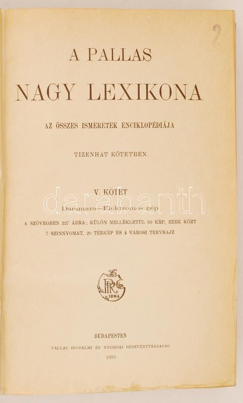 A Pallas nagy lexikona. Dammara- elektromos gép. Az összes ismeretek enciklopédiája tizenhat kötetben. I. kötet A szövegben 227 ábra; külön mellékletül 69 kép, ezek közt 7 színnyomat, 20 térkép és 4 városi tervrajz.Budapesten, 1893, Pallas. Aranyozott, kiadói félbőr kötésben. Gerinc picit sérült, egyébként korának megfelelő állapotban.