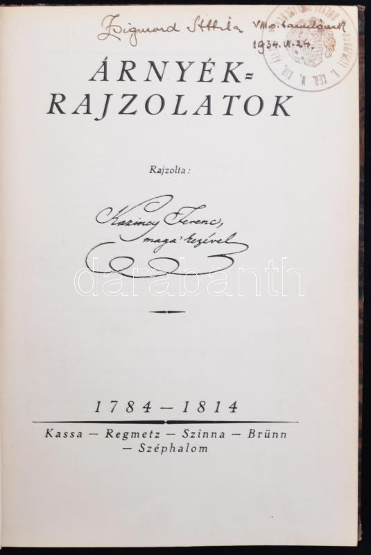 Árnyékrajzolatok. Rajzolta Kazinczy Ferenc maga' kezével 1784-181... https://www.darabanth.com/de/271-Fernauktion/271.0/Bucher/Bucher-Sonstige-Raritaten~46/Arnyekrajzolatok-Rajzolta-Kazinczy-Ferenc-maga-kezevel-1784-1814-Bp-1928-Konyvbaratok-SzC3~II1242314
