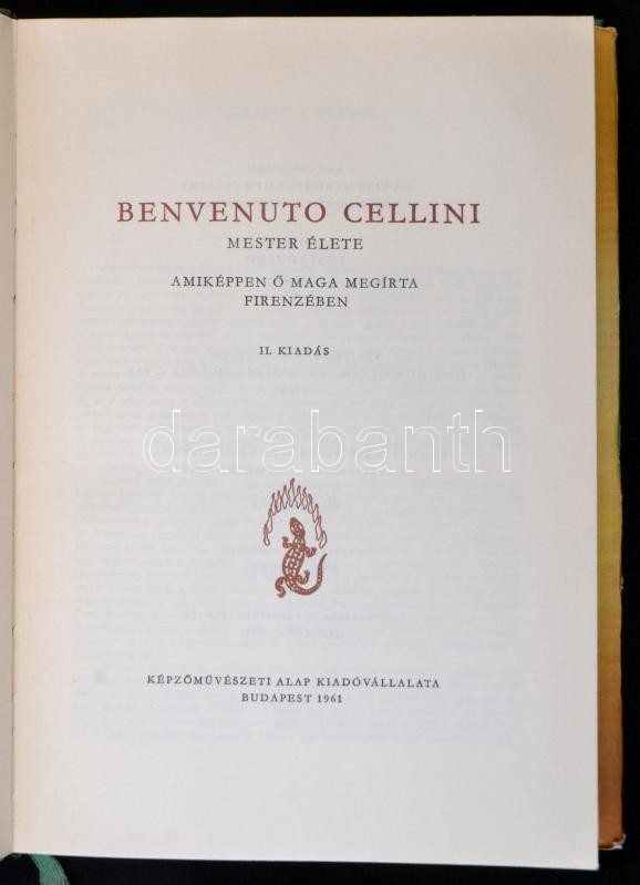 Benvenuto Cellini mester élete amiképpen ő maga megírta Firenzében. Molnár C. Pál illusztrációkkal. Budapest, 1961, Képzőművészeti Alap Kiadóvállalata. Kiadói egészvászon kötésben kissé szakadt fedőborítóval.