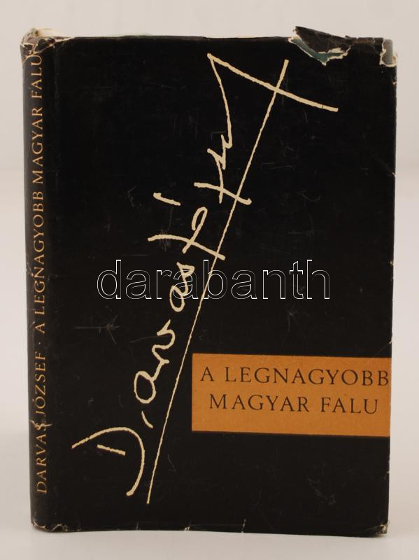 Darvas József: A legnagyobb magyar falu. Budapest, 1965, Szépirodalmi Könyvkiadó. Egészvászon kiadói papírborítóval, 213 p. A kiadói papírborító szakadozott, karcos. A hátsó szennylapon ceruzával végigjegyzetelt. A könyvben több helyen ceruzás bejegyzés. A könyvet a szerző dedikálta Kovács Sándor Iván irodalomtörténész, kritikus, egyetemi tanárnak.
