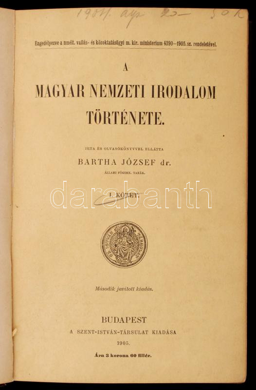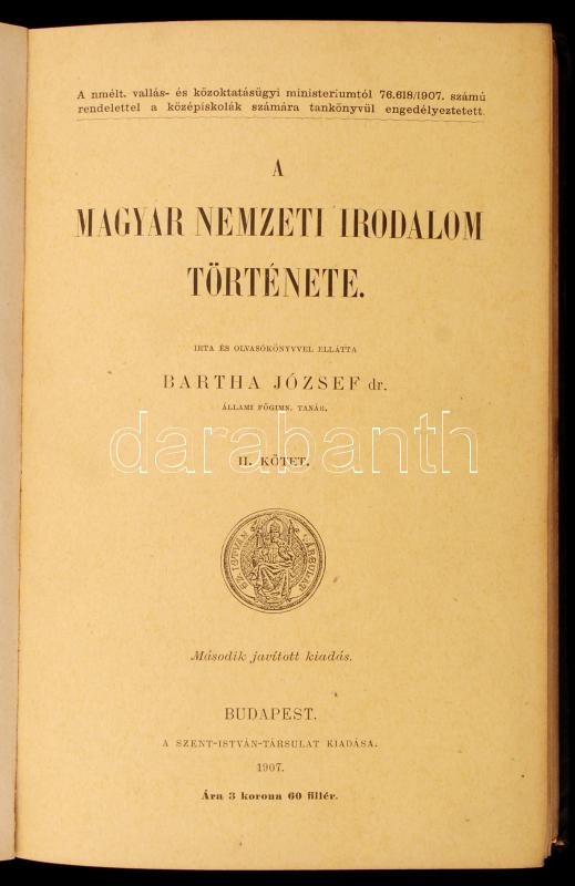 Dr. Bartha József: A Magyar Nemzeti Irodalom Története I-II. Budapest, 1910, Szent István Társulat, 397+372 p. Második, javított kiadás. Átkötött egészvászon kötés. A borító kopottas, és a gerince sérült.