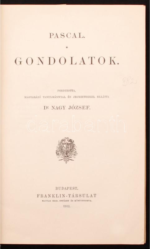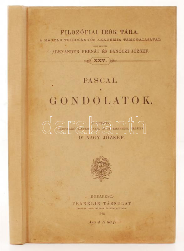 Pascal: Gondolatok. Ford. Nagy József. Bp., 1912, Franklin. 236 p. Kés... https://www.darabanth.com/de/271-Fernauktion/271.0/Bucher/Bucher-Sonstige-Raritaten~46/Pascal-Gondolatok-Ford-Nagy-Jozsef-Bp-1912-Franklin-236-p-Kesobbi-egeszvaszon-kotesb~II1291613