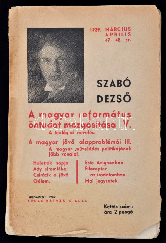 Szabó Dezső: A magyar református öntudat mozgosítása V. - A magyar jövő alapproblémái III. Szabó Dezső Újabb Művei 47-48 p. Budapest, 1939, Ludas Matyás Kiadás. Kiadói papír kötés, 144 p. A kiadói papírborítója szakadozott.