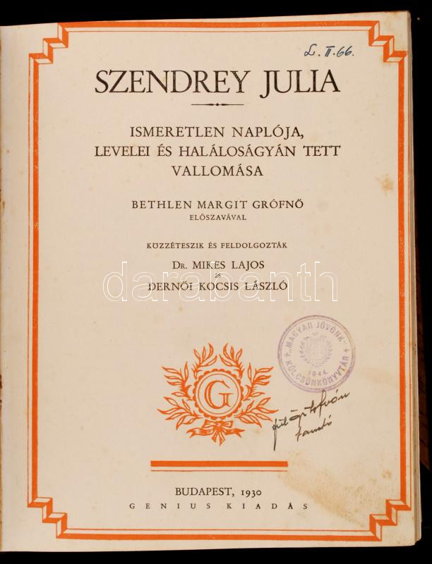 Szendrey Júlia ismeretlen naplója, levelei és halálos ágyán tett vallomása. Bethlen Margit grófnő előszavával. Közzéteszik és feldolgozták dr. Mikes Lajos és Dernői Kocsis László.