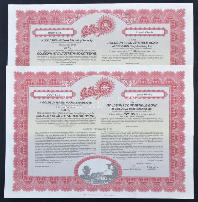 Beschreibung: Budapest 1994. "Goldsun Hűtőipari Részvénytársaság" névre szóló kötvénye 100ft-ról (2x) egymás utáni sorszámmal T:I